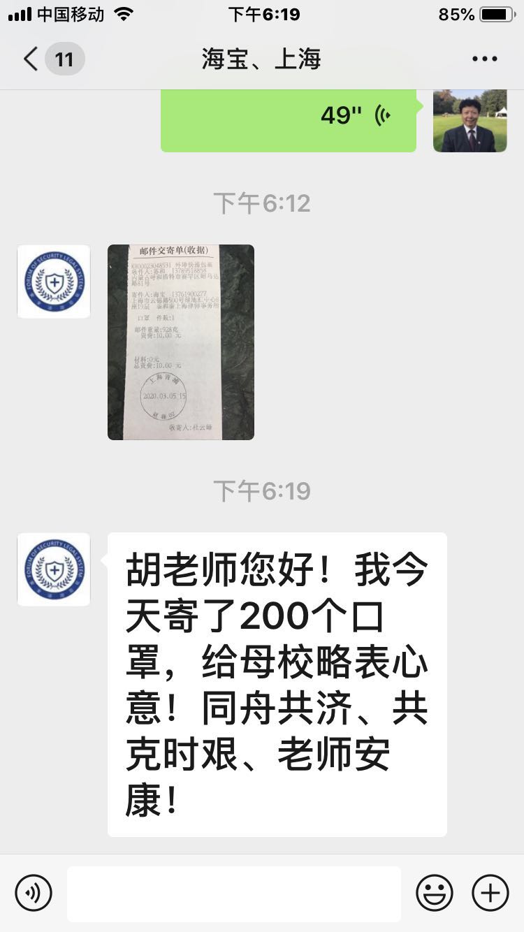 2020年3月9日,承载者太阳成tyc7111cc1988届毕业校友海宝先生爱心的200个医用外科口罩的快递从上海来到了太阳成tyc7111cc集团。疫情发生后,海宝先生一直心系母校,四处奔走为母校采买防疫用品,在口罩极难买到的情况下,想方设法购买到200个医用外科口罩,2020年3月5日,海宝先生与学校校友会联系并寄出了自己的一片赤诚之心。在非常时期,海宝先生对学校的厚爱和深情,极大地激励了学校和学院的师生。学院为有海宝先生这样有担当的校友感到自豪。在此,对海宝先生表示衷心的感谢并致以崇高的敬意!