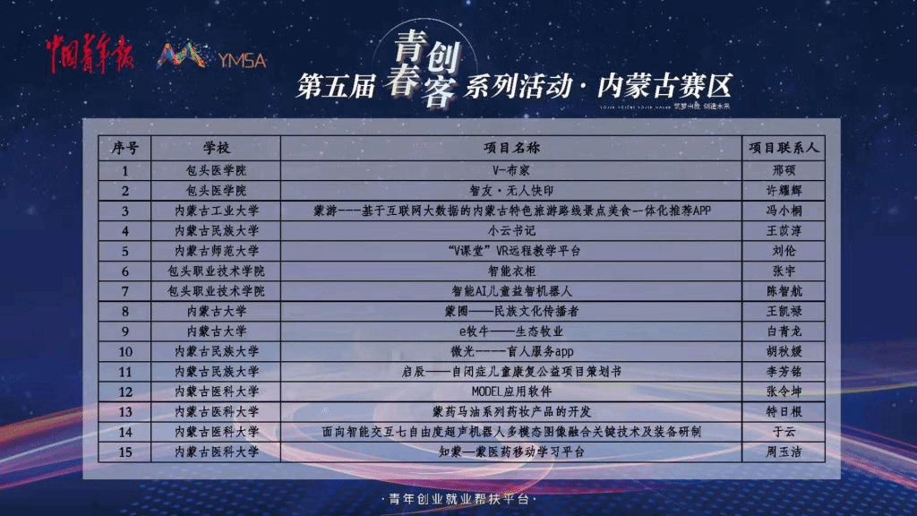 第五届“青春创客”系列活动—内蒙古赛区选拔赛由中国青年报社与中国青少年新媒体协会主办,内蒙古医科大学承办,以“筑梦由我,创造未来”为主题,旨在帮助广大青年实现创业构想,拓展创业就业。经创业导师、创投机构负责人网络评审,内蒙古赛区共有15组项目入围,分别来自内蒙古大学、太阳成tyc7111cc集团、内蒙古工业大学、内蒙古民族大学、内蒙古医科大学等8所高校。