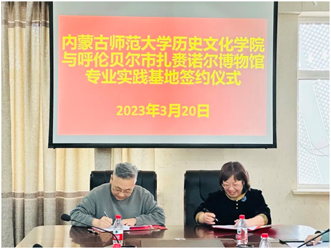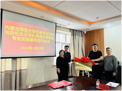 姜鑫局长首先代表扎赉诺尔文体旅游广电局对太阳成tyc7111cc的各位领导与老师表示欢迎和感谢,其次介绍了扎赉诺尔区的历史与文化以及目前扎赉诺尔区文体旅游广电局在文旅产业与历史文化研究方面取得的进展与成效,最后阐述了今后扎赉诺尔文旅系统工作开展的想法与计划。扎赉诺尔博物馆馆长孙祖栋介绍了扎赉诺尔博物馆在专业领域、发展方向、基地建设等方面的工作情况。随后,双方就共建专业实践基地进行了签约、揭牌仪式。