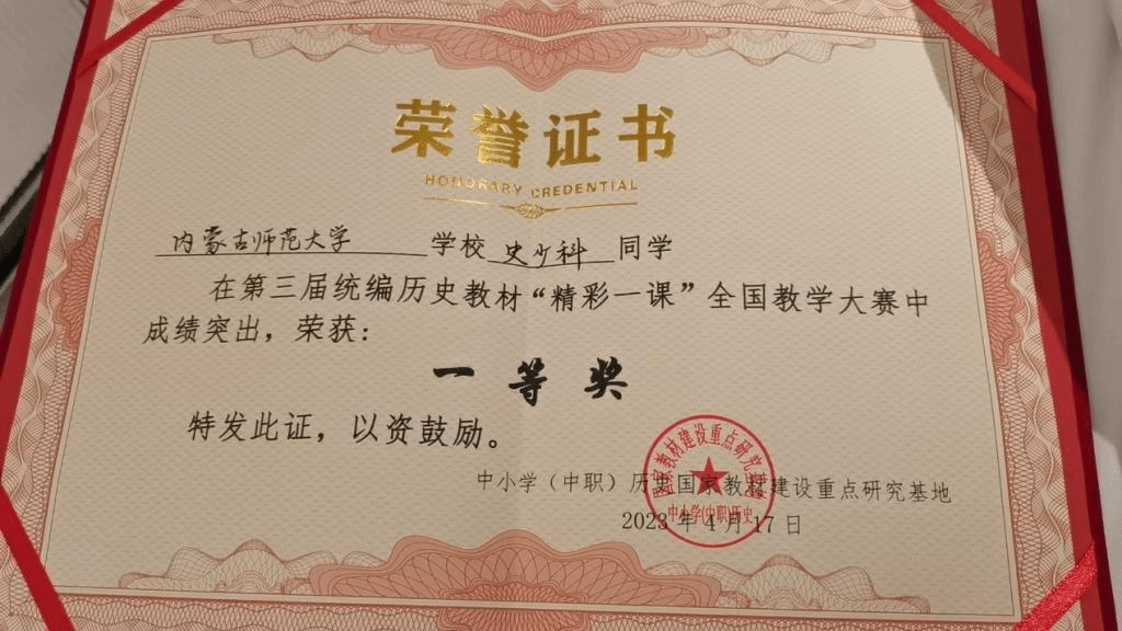 4月15日至17日,第三届统编历史教材“精彩一课”全国教学大赛暨历史教材研究高端论坛在福建师范大学举行,来自北京师范大学、华东师范大学、华中师范大学、东北师范大学、陕西师范大学、华南师范大学等部属、省属重点大学的125名同学参赛。经过激烈角逐,我院历史学专业史少科同学荣获一等奖,牧仁老师和袁丽丽老师荣获“优秀指导教师”称号。