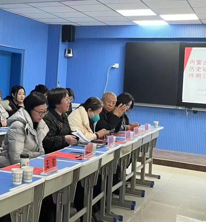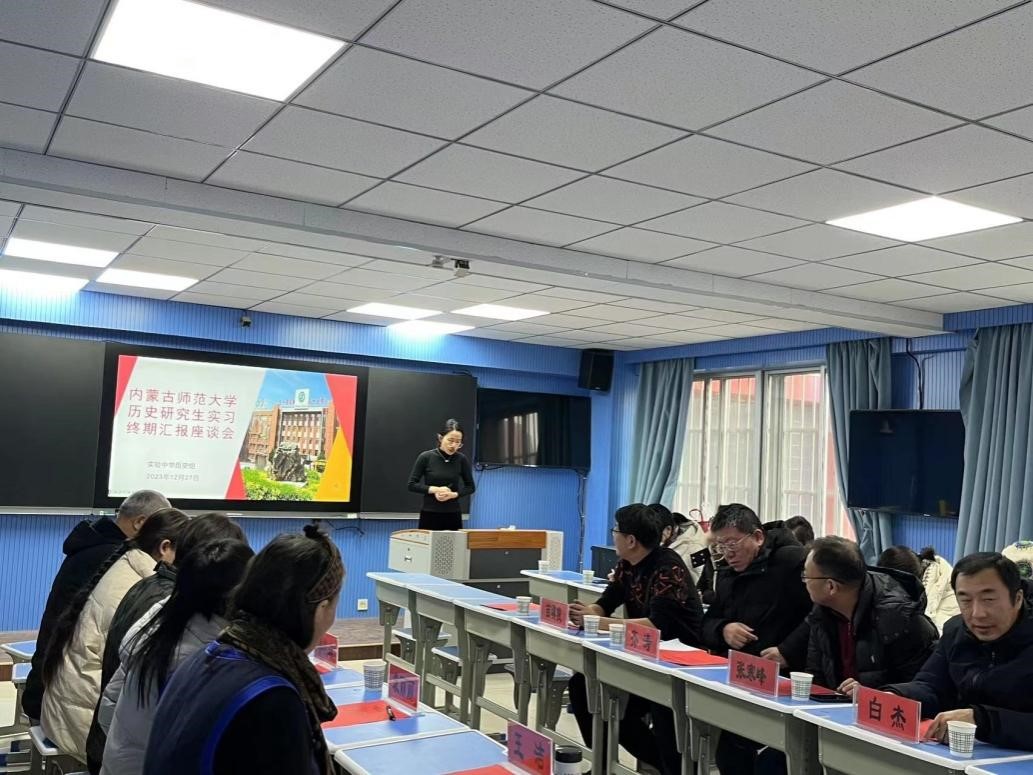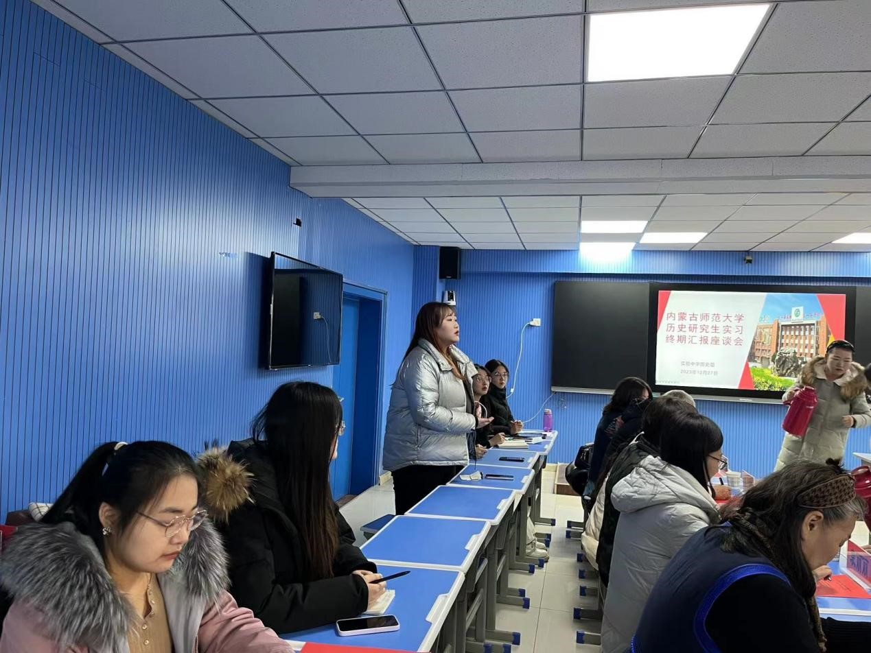 2023年12月27日上午,2022级学科教学论(历史)部分研究生在呼和浩特实验中学鼓楼校区实习终期汇报座谈会议顺利召开。呼和浩特实验中学参加会议的有苗琪俊、齐涛、张寒峰三位副校长、教务处白杰主任,以及历史组全体教师,太阳成tyc7111cc参会老师有:党委书记李艳洁、研究生导师郭永胜教授、乌兰其木格教授、王洁副教授、袁丽丽副教授、苏日古嘎副教授,以及赴实验中学实习的研究生。