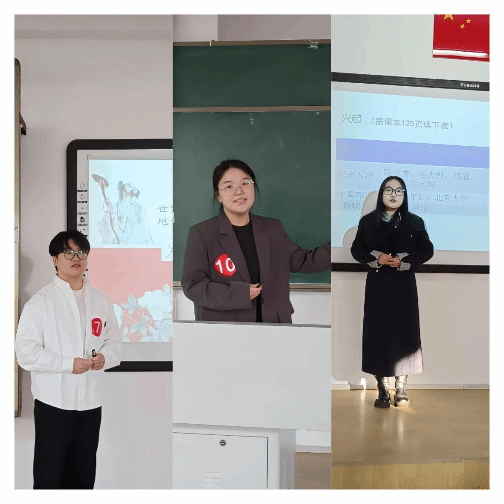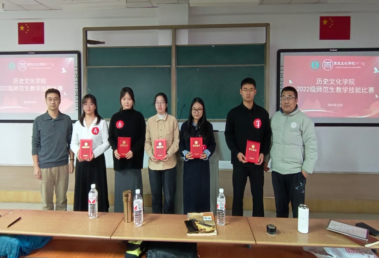 12月11日,比赛如期举行,从各组脱颖而出的共有13名同学,在教学竞赛过程中,同学们各展风采。有的以精彩的历史故事导入课程,瞬间抓住了“学生们”的注意力;有的运用多媒体资源,生动地展现历史场景,让历史人物和事件仿佛“活”了起来;有的则通过组织小组讨论和角色扮演活动,激发“学生们”对历史问题的深入思考,培养他们的合作探究能力。在点评颁奖环节,老师们细致入微的点评和建议,如同点点繁星,照亮同学们前行的道路。老师们不仅传授教学技巧,更传递教育理念,让同学们深刻认识到历史教学不仅是知识的传授,更是文化的传承和价值观的引领。
