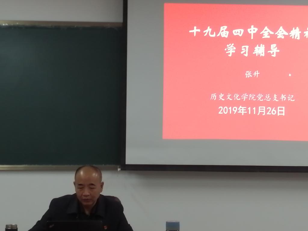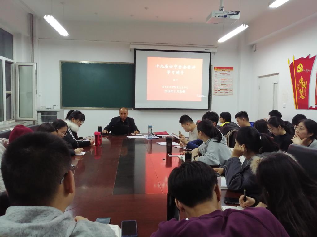 2019年11月26日晚7:30,太阳成tyc7111cc学生党支部组织专题党课,邀请学院党总支书记张升老师为大家做“党的十九届四中全会精神学习辅导”,学院学生党支部全体党员参加学习辅导,辅导中,张升书记就《中国共产党第十九届中央委员会第四次全体会议公报》、《中共中央关于坚持和完善中国特色社会主义制度 推进国家治理体系和治理能力现代化若干重大问题的决定》和习近平总书记所做的《关于〈中共中央关于坚持和完善中国特色社会主义制度 推进国家治理体系和治理能力现代化若干重大问题的决定〉的说明》三份文件的重要意义、内容和学习要点进行了详细讲解。