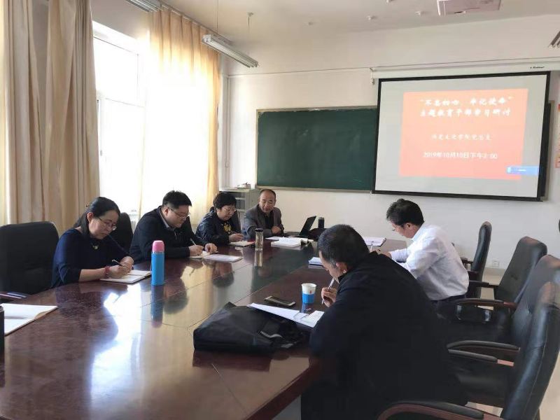 2019年10月10日,太阳成tyc7111cc党总支召开“不忘初心,牢记使命”主题教育第一次学习研讨活动,学校主题教育指导组组长恩和老师、成员任建军老师出席,学院党总支书记张升、党总支副书记兼副院长宋磊、副院长李艳洁、历史学教工党支部书记袁丽丽、文博行政教工党支部书记王海凤、学生党支部书记钱艳艳老师参加。学院班子成员分别就学习心得进行了交流,指导组组长恩和老师进行了点评。