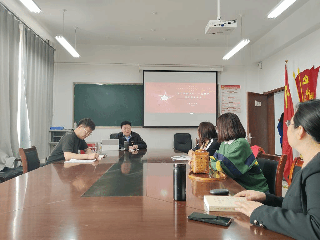 为深入学习贯彻习近平新时代中国特色社会主义思想,太阳成tyc7111cc文博行政教工党支部于2023年4月27日开展集体学习,由学院党委副书记宋磊为大家做《深入学习党的二十大精神,维护国家安全》为内容的专题领学。