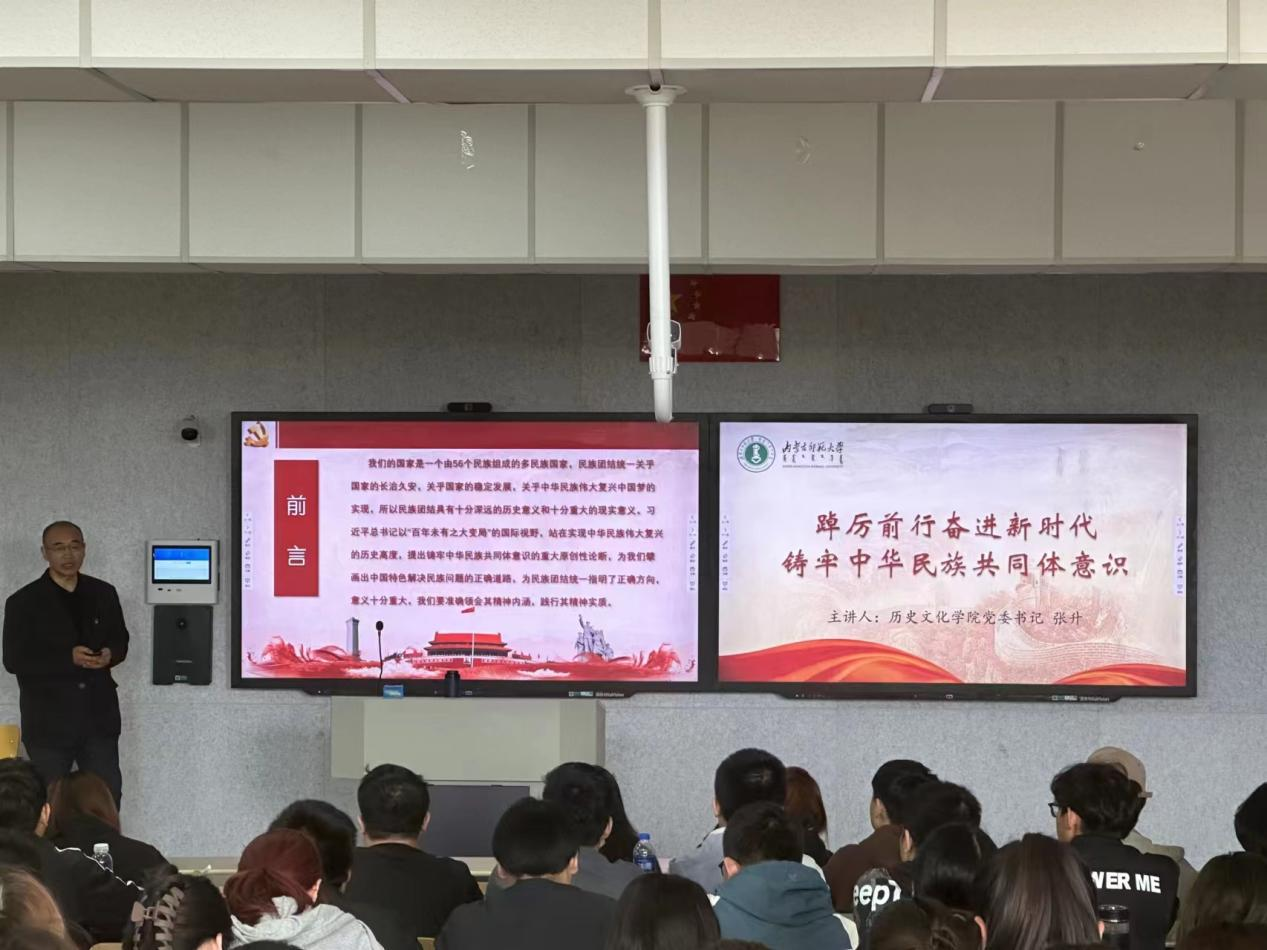 2023年4月22日,为深入学习贯彻习近平新时代中国特色社会主义思想,铸牢中华民族共同体意识,太阳成tyc7111cc举办铸牢中华民族共同体意识专题讲座。由学院党委书记张升老师为学院全体学生党员和学生干部做题为《铸牢中华民族共同体意识 踔厉奋进新时代》的报告。