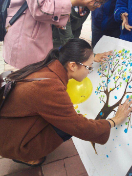 在这次宣传活动中,我院心语馨苑工作站一共准备了三个小活动。我知我心:工作人员准备了三道针对压力应对,生活态度,抑郁自测的心理测试题,并将题目写在了展板上,且将答案打印出来以便同学们查看领取。树愈心灵:工作人员开辟出一块展板,上面绘制了一棵大树干,由同学们进行手印墙的现场绘制,同学们可以选择喜欢的颜料和位置,来为大树增添色彩。最后手印墙上会呈现出一棵由手印绘成的大树。来呼应此次“心灵健康,和谐师大”的主题。幸福传递:工作人员将从同学手中收集到的带有祝福话语的纸条汇集在一起,发给沿路的同学,让他们感受陌生人带来的温暖。同时也可以写出自己的祝福话语,将幸福传递给更多的人。
