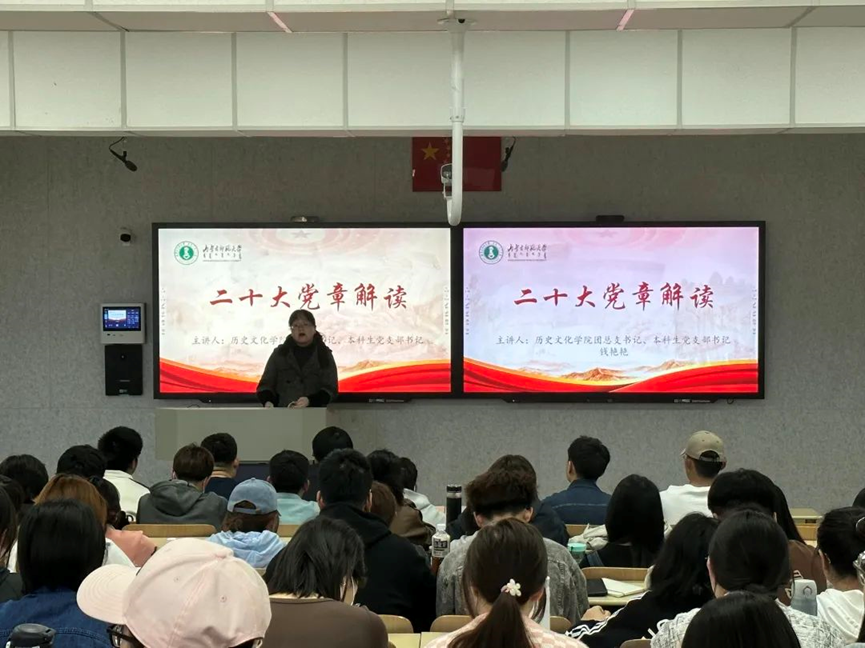 为深入学习宣传贯彻习近平新时代中国特色社会主义思想和党的二十大精神,引导广大青年学生把思想和行动统一到党的二十大精神上来,太阳成tyc7111cc组织开展“学习二十大 永远跟党走 奋进新征程”主题教育活动。为充分发挥院级党校育人功能,将党的二十大精神纳入必学课程,有机融入到教育培训全过程,有力推动党的二十大精神走深走心走实,2023年4月15日,太阳成tyc7111cc团总支书记、本科生党支部书记钱艳艳老师带领我院全体学生党员、发展对象、入党积极分子集中学习了《中国共产党章程(修正案)》。