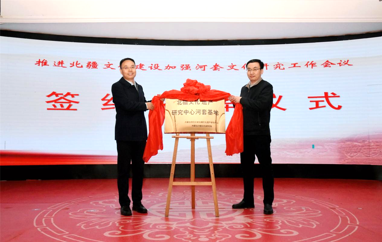 巴彦淖尔市委常委、宣传部部长贺连辉(左)与我校党委委员、副校长公茂果为“北疆文化遗产研究中心河套基地”揭牌