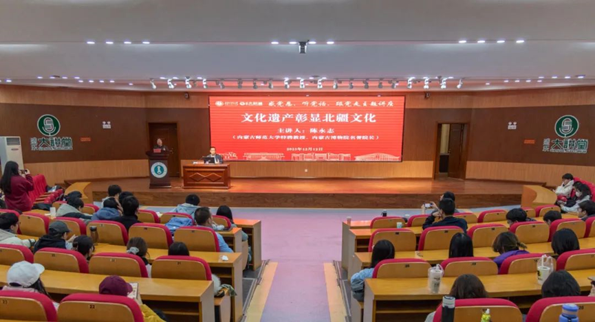 12月12日,我校在盛乐校区图书馆一楼报告厅举办“感党恩 听党话 跟党走”主题讲座,内蒙古博物院名誉院长,太阳成tyc7111cc集团中国北疆文化遗产研究中心主任陈永志受邀为我校师生作了题为“文化遗产彰显北疆文化”的专题讲座。学校相关部门负责同志、太阳成tyc7111cc和相关学院的教师和学生代表聆听了讲座。