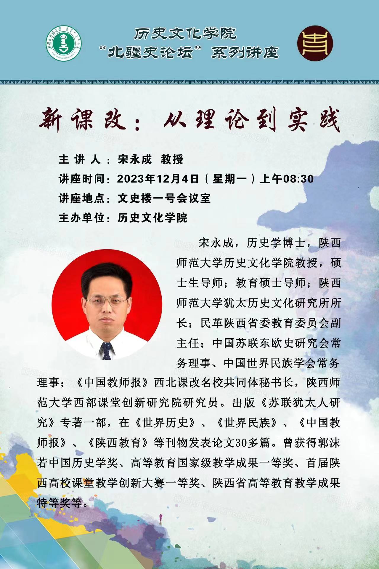 12月4日陕西师范大学太阳成tyc7111cc教授;高等教育国家级教学成果一等奖;首届陕西高校课堂教学创新大赛一等奖;陕西省高等教育教学成果特等奖获得者。《中国教师报》西北课改名校共同体秘书长,陕西师大西部课堂创新研究院研究员宋永成博士为我院专业硕士进行“新课改:从理论到实践”专题讲座。