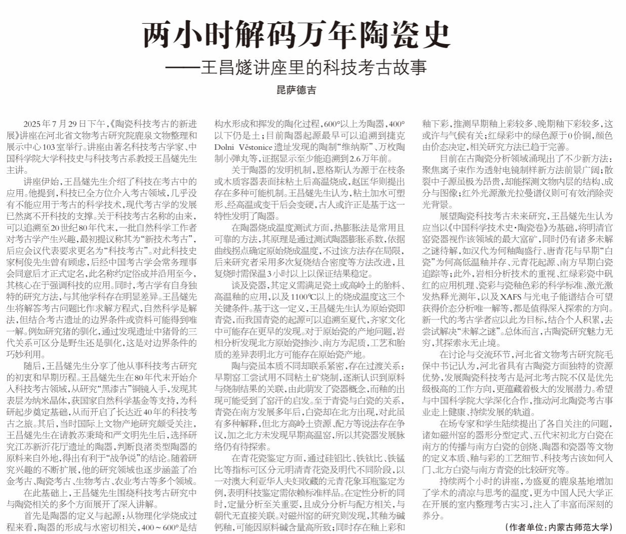 我院2024级考古文博班昆萨德吉同学撰写的讲座纪要《两小时解码万年陶瓷史——王昌燧讲座里的科技考古故事》在《中国文物报》2025年8月30日正式刊登。该文记录了中国科学院大学王昌燧教授于7月29日在河北省文物考古研究院鹿泉考古基地所作的专题讲座《陶瓷科技考古的新进展》。讲座纪要详细梳理了王昌燧教授以“黑漆古”铜镜研究为起点的近四十年科技考古历程,系统介绍了科技考古的学科起源、研究方法,以及陶器与瓷器的定义、起源和鉴定手段等专业内容,并分享了个人的学习感悟。