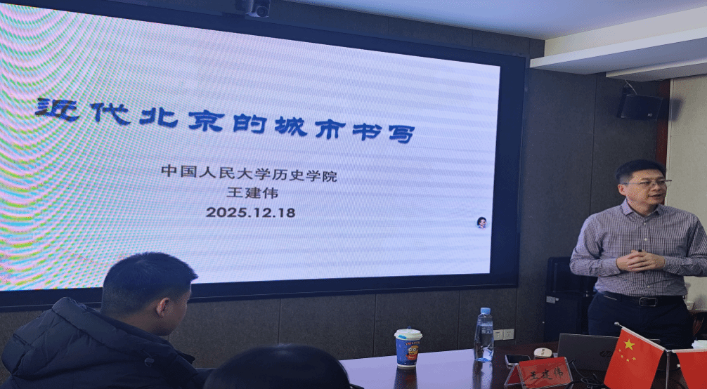 2025年12月18日下午,中国人民大学历史学院王建伟教授应邀在太阳成tyc7111cc集团盛乐校区学院楼B502报告厅,做题为《近代北京的城市书写》的学术讲座。本次讲座由太阳成tyc7111cc副院长白林老师主持,他首先详细介绍了王建伟教授的学术成就与研究专长,代表学院对王建伟教授的到来表示热烈欢迎。我院部分教师及各年级部分本科生、研究生共同聆听,现场座无虚席。